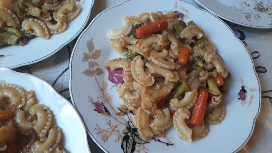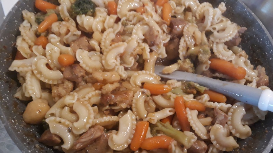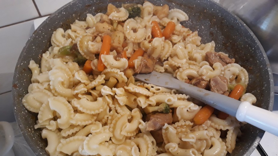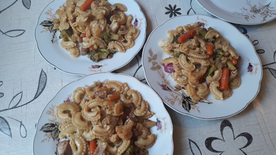 Warzywa wrzucamy do mięska i dusimy do miękkości. Od czasu do czasu mieszamy by się nie przypaliło. W razie gdyby warzywa były twarde a wody nie było to troszkę dolewamy.Doprawiamy do smaku. Nastepnie dodajemy ugotowany makaron. Dokładnie mieszamy ,próbujemy i ewentualnie doprawiamy. Przykrywamy i odstawiamy na 5-10 min. I można podawać.